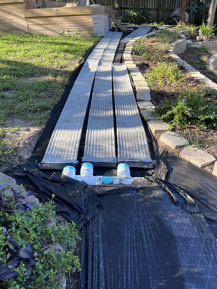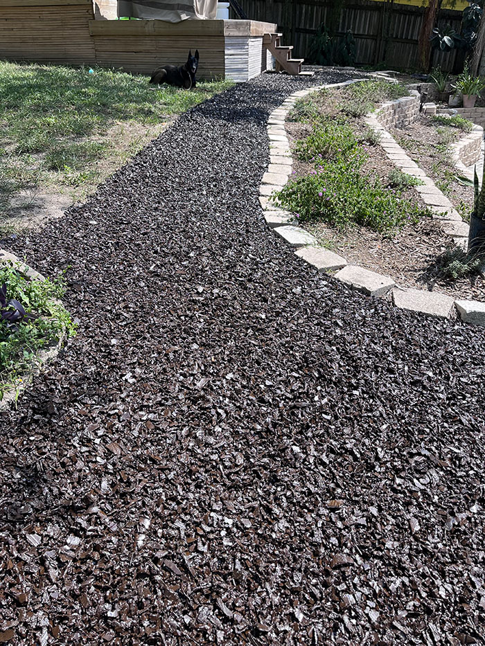 This customer had flooding water coming down her back yard. The solution was to install Hydraway Drainage system with Flexi Mulch over top.